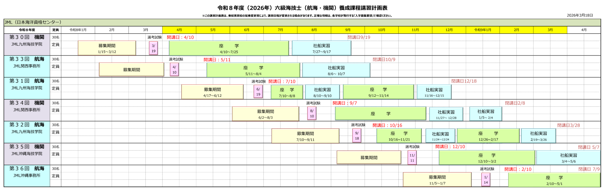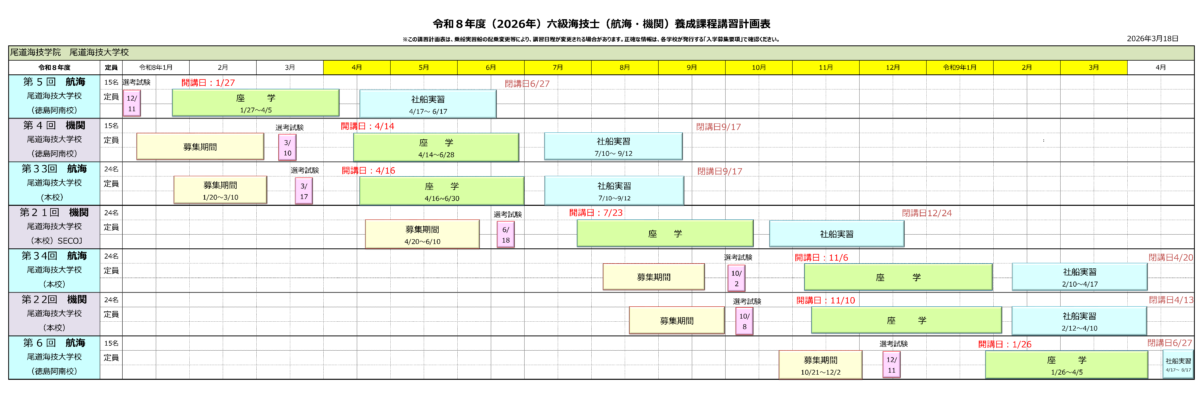 航海34回生 講習期間:2026年 11月 6日(金)~2027年 4月20日(火)